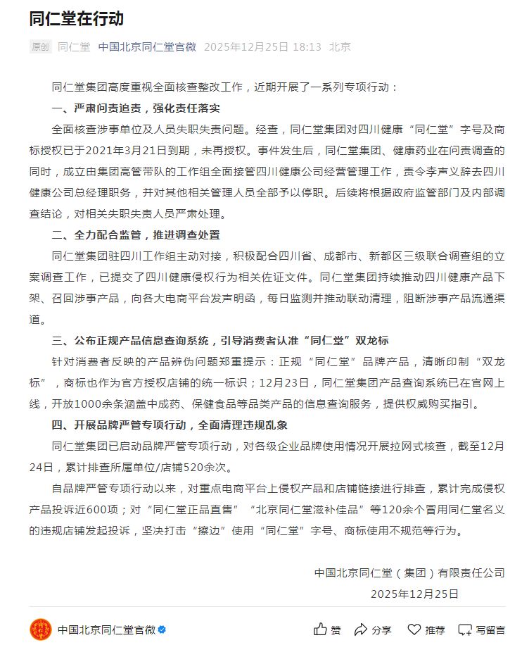 12月25日,同仁堂发布声明表示,集团高度重视全面核查整改工作,近期开展了一系列专项行动。包括全面核查涉事单位及人员失职失责问题。责令李声义辞去四川健康公司总经理职务,并对其他相关管理人员全部予以停职。同仁堂集团驻四川工作组主动对接,积极配合四川省、成都市、新都区三级联合调查组的立案调查工作,已提交了四川健康侵权行为相关佐证文件。同仁堂集团持续推动四川健康产品下架、召回涉事产品,向各大电商平台发声明函,每日监测并推动联动清理,阻断涉事产品流通渠道。