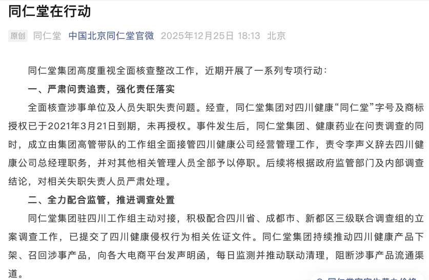 同时,同仁堂集团全力配合监管,推进调查处置。该集团驻四川工作组主动对接,积极配合四川省、成都市、新都区三级联合调查组的立案调查工作,已提交了四川健康侵权行为相关佐证文件。该集团持续推动四川健康产品下架、召回涉事产品,向各大电商平台发声明函,每日监测并推动联动清理,阻断涉事产品流通渠道。