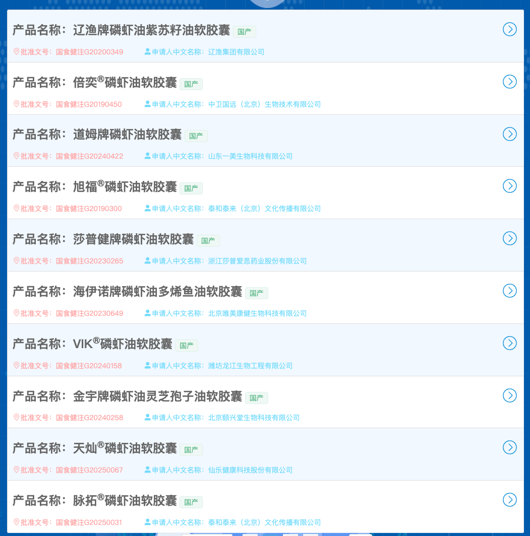 界面新闻记者查询国家市场监督管理总局保健食品注册备案信息发现,截至目前,国内备案的含磷虾油保健食品仅有11款,且全部为软胶囊剂型。
