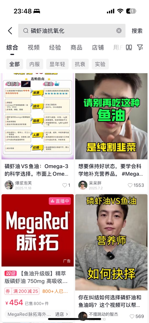 在这样的逻辑下,鱼油往往被描绘成“吸收一般、有腥味、属于传统老牌保健品”;而磷虾油则被包装成“吸收更好、不返腥、是更先进的新一代产品”。在内容营销话术上,最常见的一种结构是“鱼油升级”“磷虾油高效吸收”。