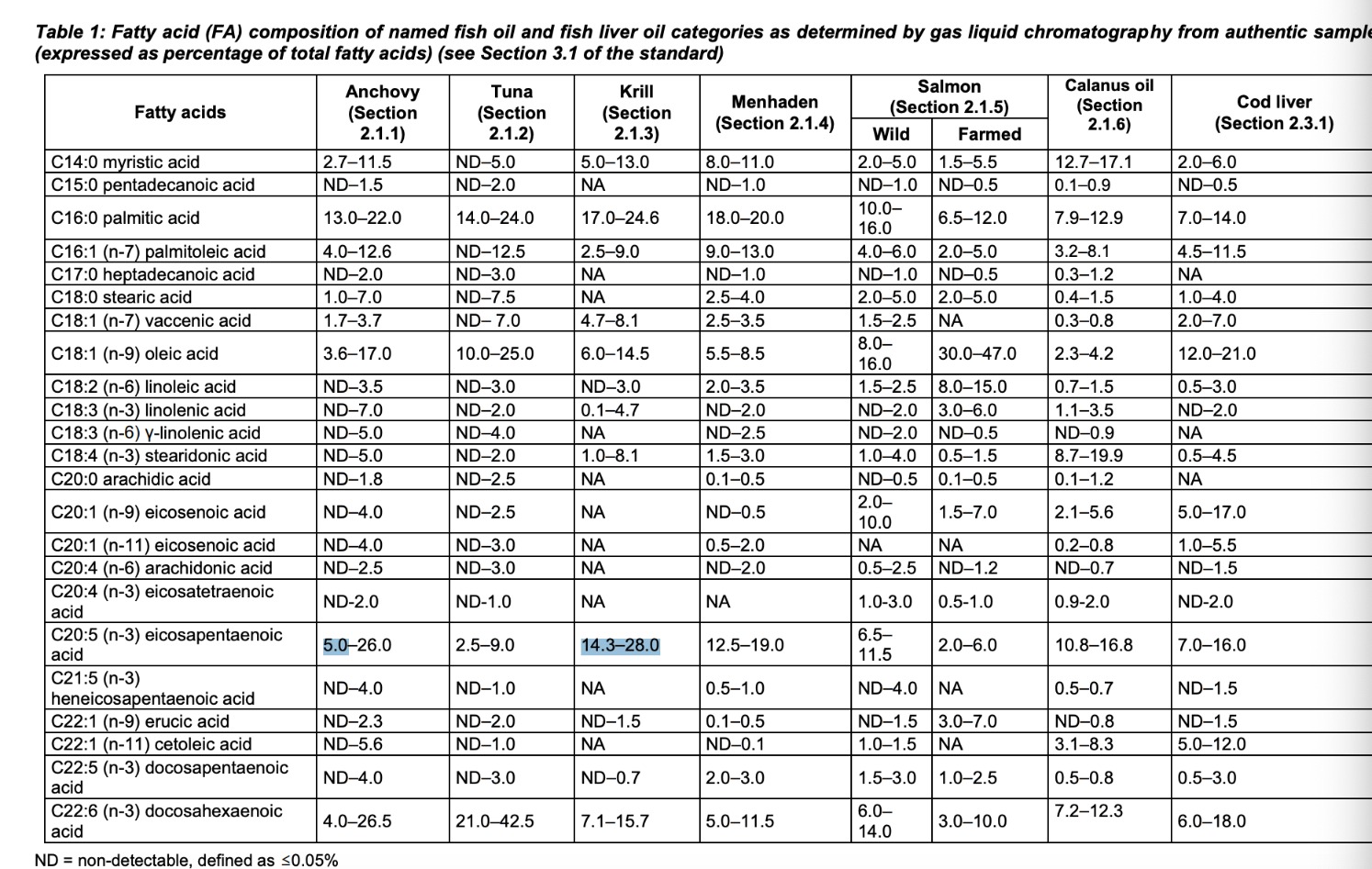 界面新闻记者检索联合国粮食及农业组织(FAO)的资料发现,比较磷虾油与鳀鱼(鱼油主要来源鱼种)的脂肪酸组成,磷虾油的EPA含量占总脂肪酸的14.3%–28.0%,鳀鱼油的EPA则为5.0%–26.0%。在DHA含量上,磷虾油为7.1–15.7%,鳀鱼油则为4.0%–26.5%。两者在EPA+DHA占总脂肪酸比例上,并无显著差别。