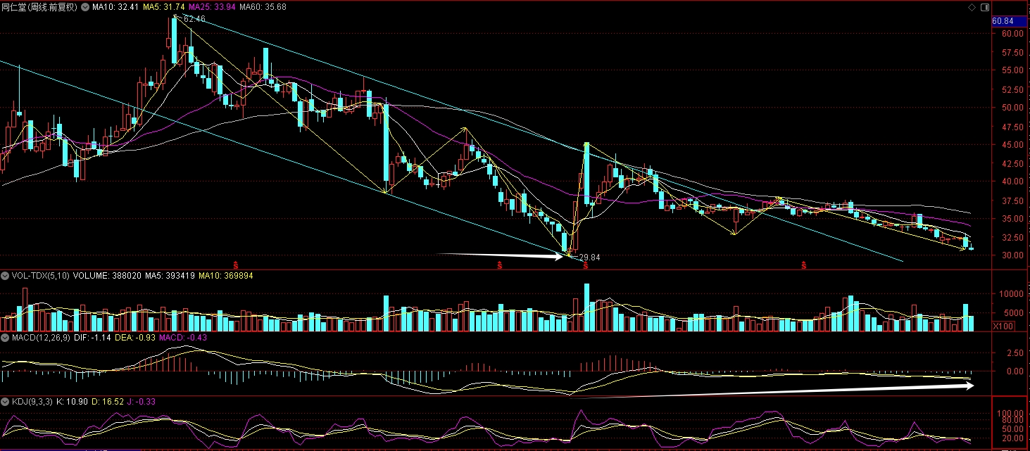 从23-24年,62杀下来到29.84是加速下跌,本应该再底部横盘个1年半载的。经过24年924暴力拉了50%,24-25演变成震荡缓跌。可以看周线已经在跌下通道外减速,并且KD处于20附近的超卖区,MACD回归0轴附近。再来哥1块钱左右破了29.84,再买一些吧,哎。