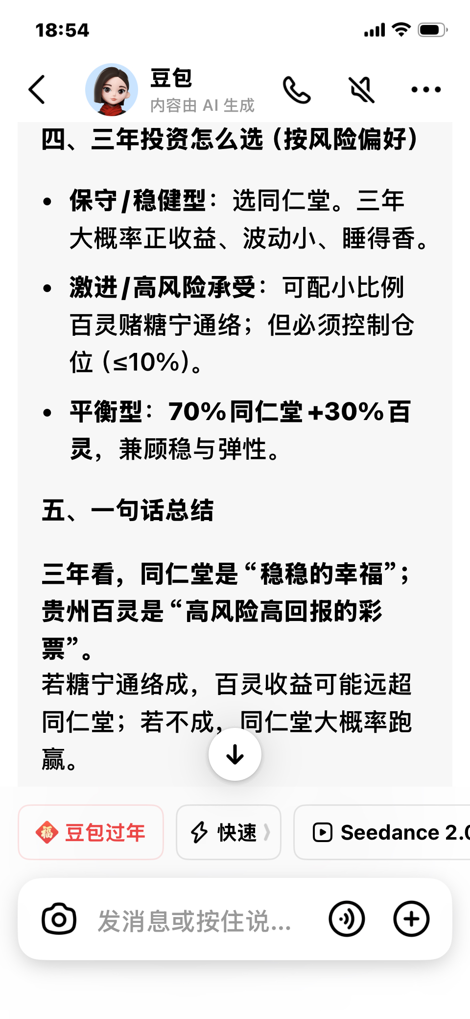 同仁堂和贵州百灵投资三年谁的收益率会更高,看豆包怎么答复这个问题。