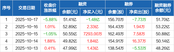 融资方面,当日融资买入7.29亿元,融资偿还8.77亿元,融资净偿还1.48亿元。融券方面,融券卖出5.3万股,融券偿还13.03万股,融券余量156.7万股,融券余额2960.01万元。融资融券余额合计51.7亿元。