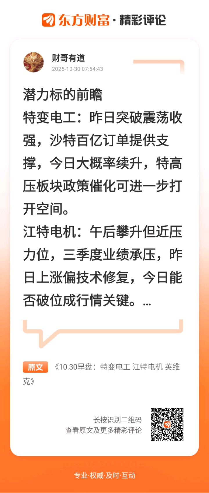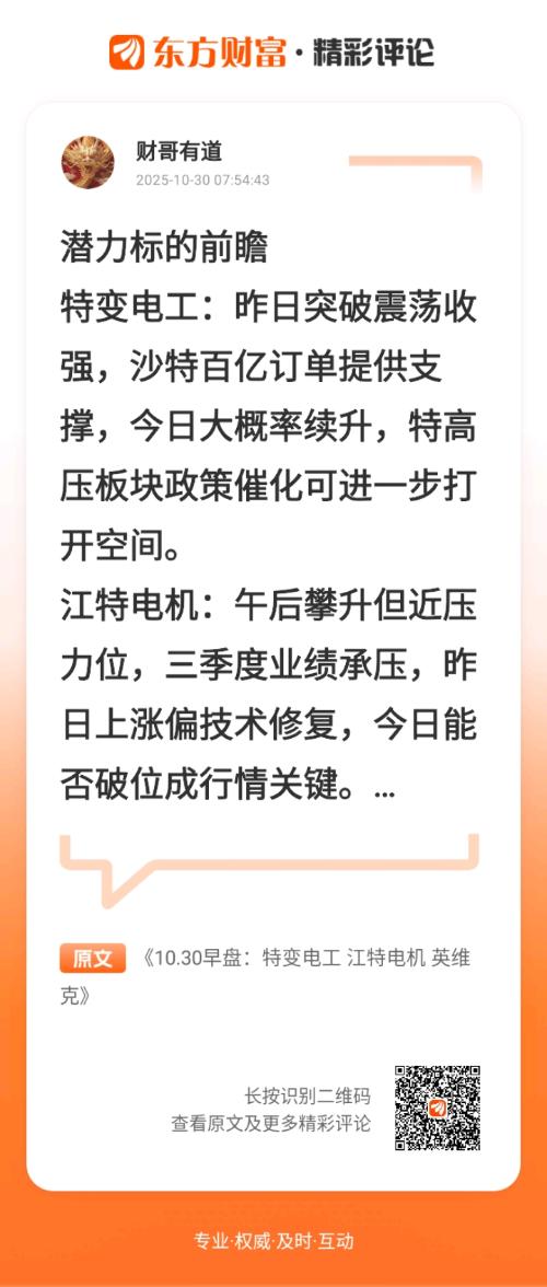 //@财哥有道 :潜力标的前瞻$特变电工(SH600089)$:昨日突破震荡收强,沙特百亿订单提供支撑,今日大概率续升,特高压板块政策催化可进一步打开空间。$江特电机(SZ002176)$:午后攀升但近压力位,三季度业绩承压,昨日上涨偏技术修复,今日能否破位成行情关键。$英维克(SZ002837)$:昨日 V 型反弹显低位承接,AI + 储能散热需求托底,守住 75 元支撑则波动或为调整机会,有望冲近期高点。指数与盘面解读指数:昨日站稳 4000 点且量能放超千亿,今日大概率震荡整理,但强势趋势未改,资金或向中小标的扩散,个股补涨机会可期。板块:光伏设备、锂电池昨日领涨,今日有望成核心主线;大科技高位分歧,前期调整板块或迎回流,策略以轮动应对,抓主线与低位补涨。持仓复盘赛力斯:昨日摆脱震荡大涨,业绩与题材共振,今日大概率续强,新能源赛道回暖可进一步打开空间。卧龙电驱:昨日震荡微跌,今日需修复跌幅重回 50 元上扭颓势,跌破 48.4 元支撑或陷深调。凯美特气:昨日独立攀升站稳成本线,半导体材料赛道有热度,今日稳住支撑或冲击更高位。万向钱潮:昨日震荡显承接,筹码集中、分歧化解,今日破昨日高点大概率续涨,长期可期。