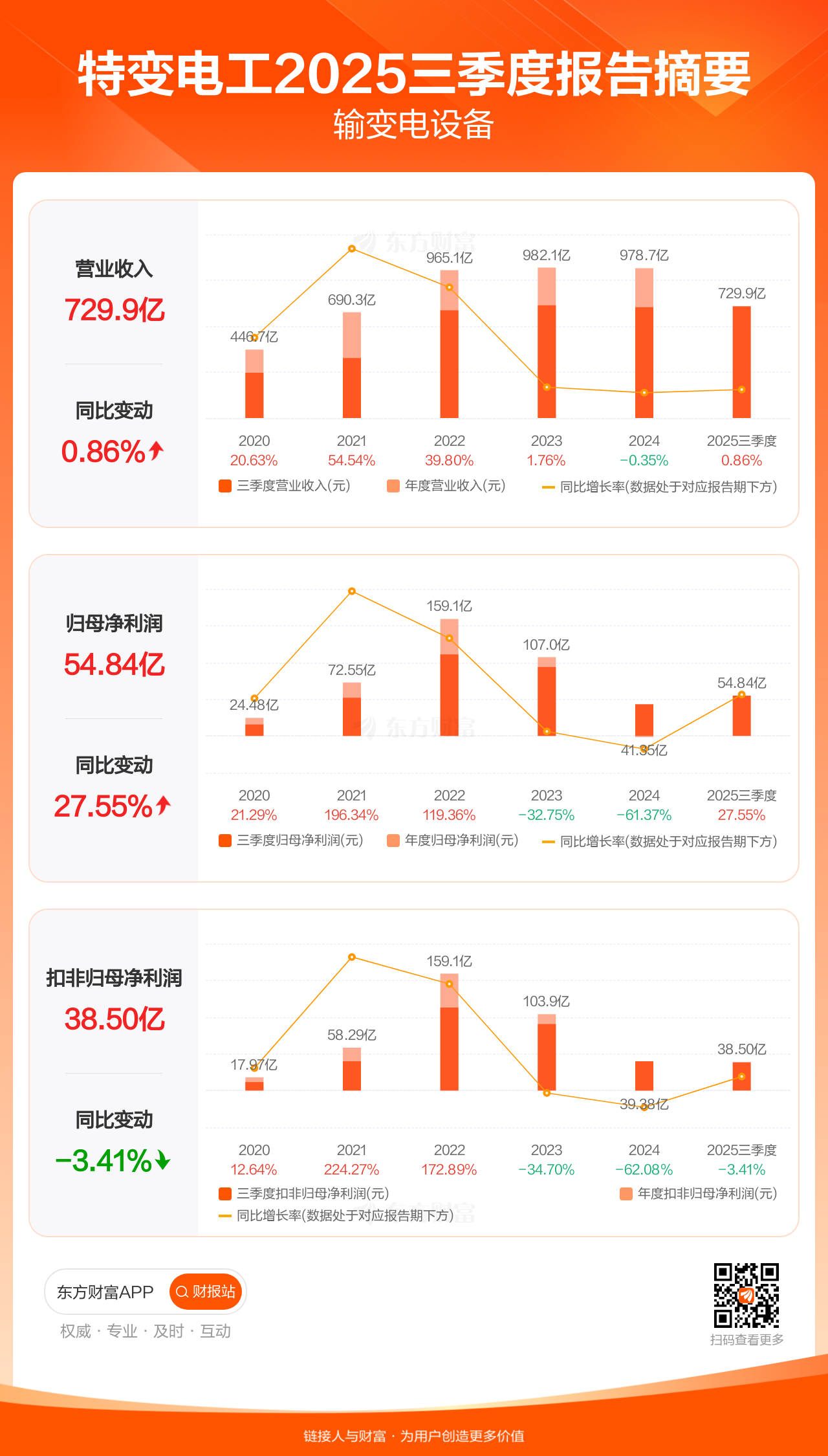 特变电工10月31日发布2025年三季报显示,公司前三季实现营业收入729.88亿元,同比增长0.86%;归母净利润54.84亿元,同比增长27.55%;扣非归母净利润38.50亿元,同比下滑3.41%。