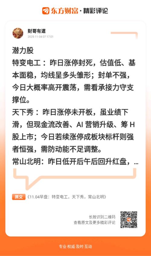 //@财哥有道 :潜力股$特变电工(SH600089)$ :昨日涨停封死,估值低、基本面稳,均线呈多头雏形;封单不强,今日大概率高开震荡,需看承接力守支撑位。$天下秀(SH600556)$ :昨日涨停未开板,虽业绩下滑,但现金流改善、AI 营销升级、筹 H 股上市;今日若续涨停成板块标杆则强者恒强,需防动能不足调整。$常山北明(SZ000158)$:昨日低开后午后回升红盘,华为鸿蒙概念、筹码集中度升;今日放量破高或激活情绪,量能不足则区间拉锯。指数动态:昨日触底回升站稳 10 日均线,短期强势巩固;今日大概率震荡,个股机会仍在,整体趋势向好,无需过度关注指数细微波动。盘面情绪与板块光伏为主线持续走强,游戏借政策回暖受关注,电网设备、银行凭稳健吸回流;科技股止跌企稳,板块轮动下热点多元扩散,行情动能足。持有复盘:赛力斯:昨日震荡走低绿盘,短期回调猛;今日关键位企稳或修复,续弱则焦虑延续,持仓观望看承接。昆仑万维 :昨日震荡微涨,多空拉扯,支撑未破、多头趋势在;今日破震荡区间可开新空间,横盘守支撑亦无碍,持仓格局。利欧股份:昨日低位震荡放量,企稳迹象显;今日站稳涨幅且续量,冲击 5.5 元或启上行,持仓格局。