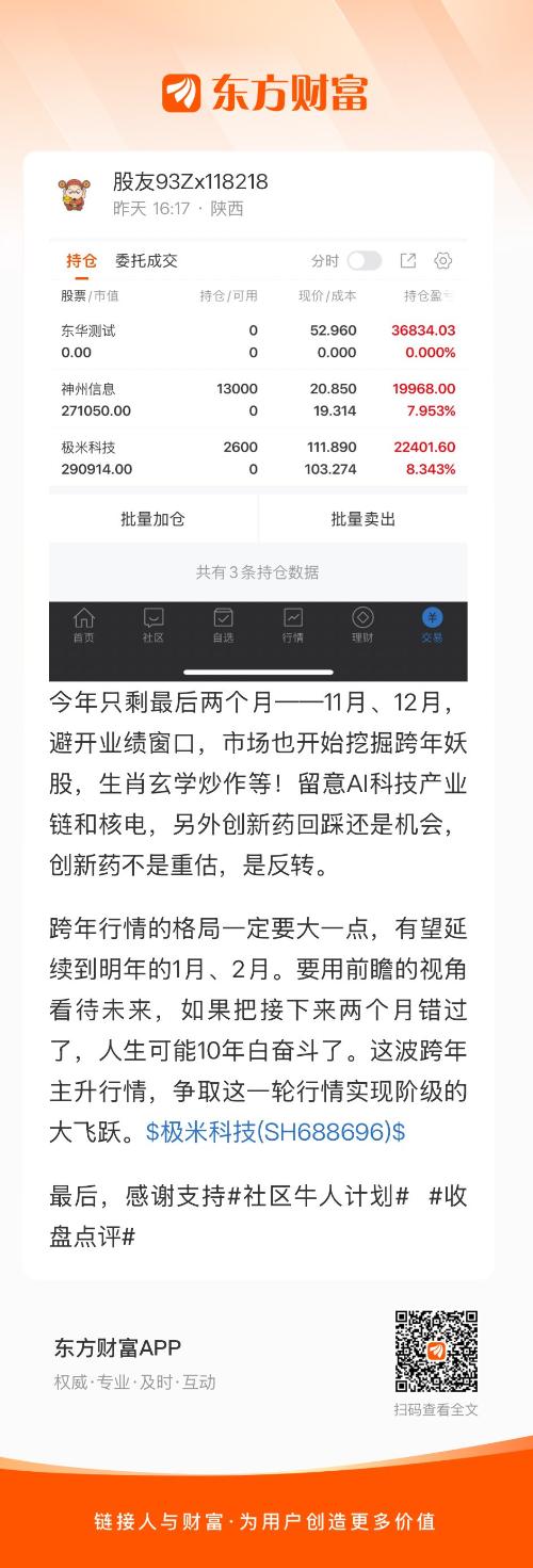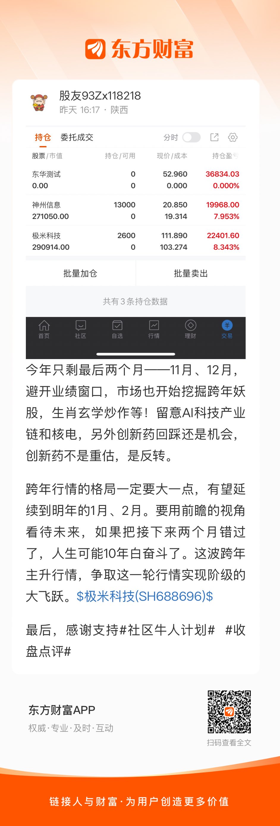 跨年行情的格局一定要大一点,有望延续到明年的1月、2月。要用前瞻的视角看待未来,如果把接下来两个月错过了,人生可能10年白奋斗了。这波跨年主升行情,争取这一轮行情实现阶级的大飞跃。$极米科技(SH688696)$