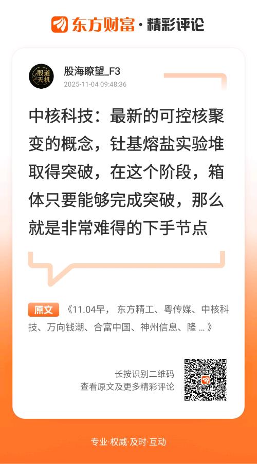 中核科技:昨天个股受到了,当前可控核聚变方面的技术性的突破的消息面影响之下,最终收出涨停板的走势。从目前的整个基本面的影响来看所以,在此情况之下中国科学院对外证实,由中国科学院上海应用物理研究所牵头打造的2兆瓦液态燃料钍基熔盐实验堆(简称“TMSR-LF1”),近期成功完成钍铀核燃料的首次转换。这一成果不仅填补了国际空白——首次获取钍元素进入熔盐堆运行后的实验数据,更让该堆成为当前全球唯一在运行且实现钍燃料入堆的熔盐堆,为熔盐堆核能系统利用钍资源的技术可行性,提供了关键初步验证。那么从当下的整体而言,个股上方压制点位只剩下23.79元的位置,所以如果能够涨停个股则能够触发强势突破的形态,那么只有涨停才是下手的节点。