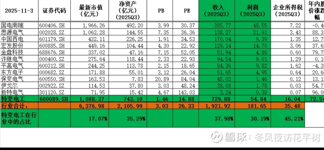 $特变电工(SH600089)$ 〖一张表格对比电气股2025 Q3部分数据〗