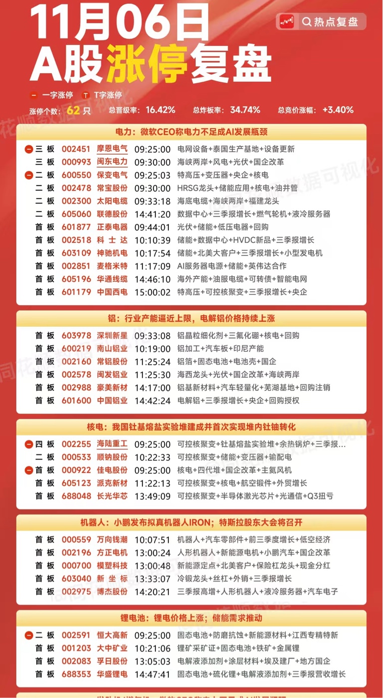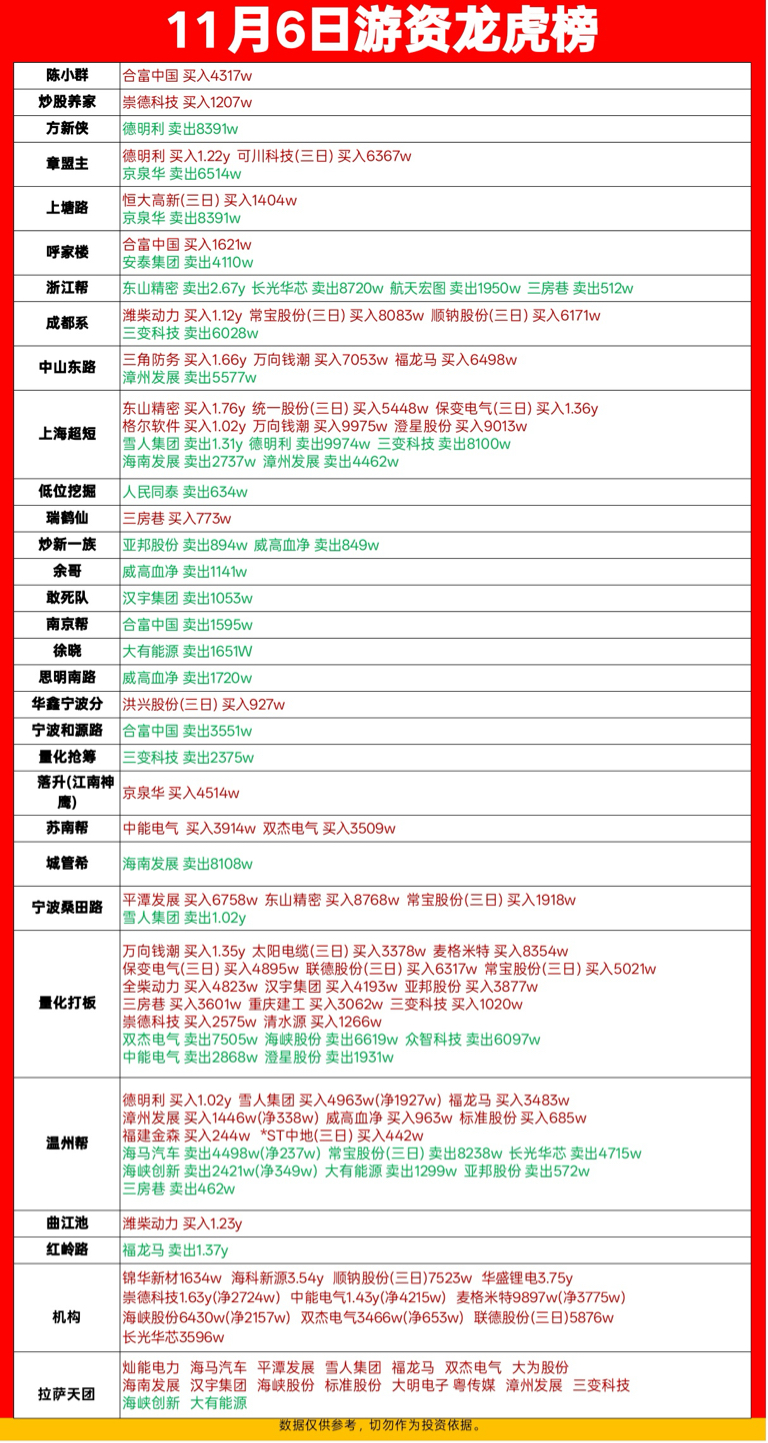 11月6日各大板块涨停个股&游资龙虎榜复开押跨年妖股免责声明:本文基于公开数据,