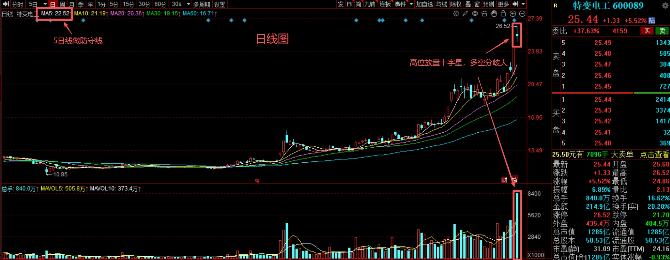 连续两涨停夹一十字星后,今日再创历史新高但收出放量十字星,显示多空分歧急剧加大。