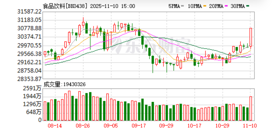 周末T计局公布数据,受扩内需等政策措施持续显效,叠加国庆、中秋假期带动影响,10月份CPI同比由降转涨、环比涨幅扩大。10月CPI同比增长0.2%,增速转正;环比上涨0.2%,增速明显高于去年同期。其中,食品CPI环比增长,同比跌幅收窄。此外11月7日,财政部发布2025年上半年中国财政政策执行情况报告,将继续实施好提振消费专项行动,对重点领域的个人消费贷款和相关行业经营主体贷款给予财政贴息,激发养老、托育等服务消费潜力。周一消费板块也是应声而起,中线角度看,当前食饮板块底层逻辑是基本面已接近底部区间,后续复苏预期逐渐升温,因此是可以继续留意的。