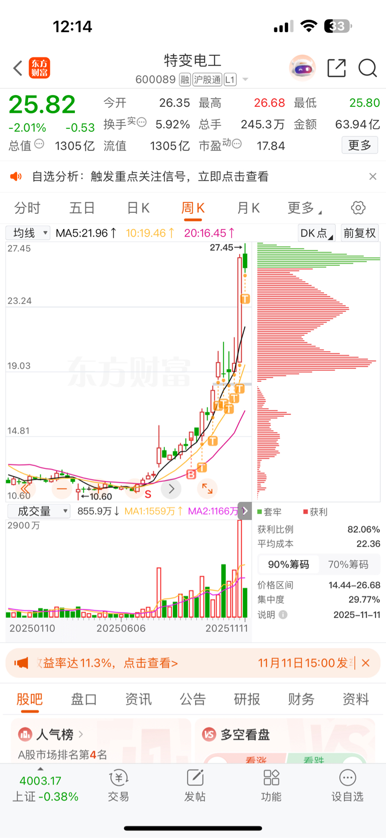 $特变电工(SH600089)$ 我 14.52 买的特变,就有人说什么主力走了,出货了,现在涨到 26 了,说一些没用的,不看好你就走。我听你的走了,赔钱赚钱你管呀!一帮什么人呢,在股吧里叭叭,炒股用你们教,赔赚自负就完事了!