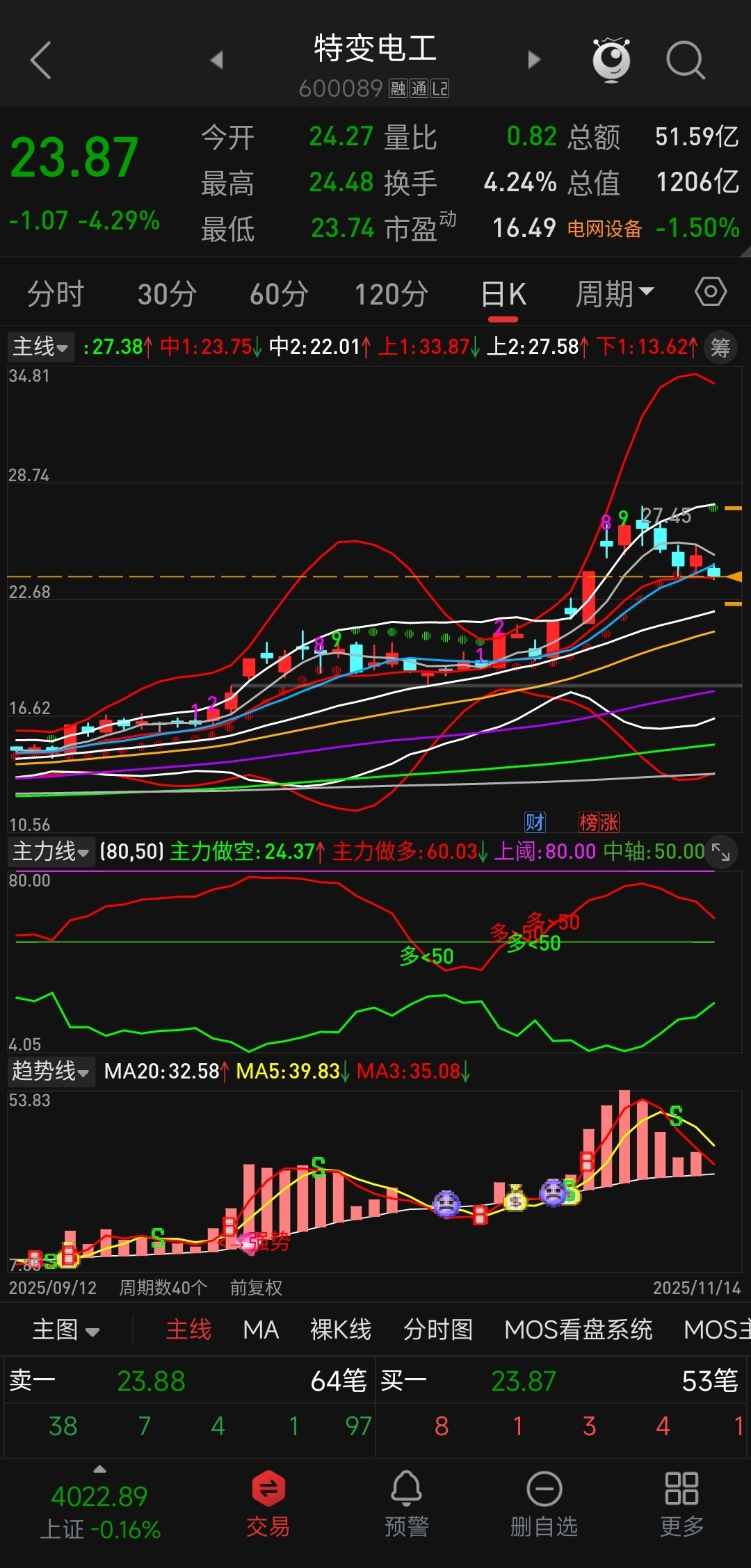 日线:收口,主力做多线下行,趋势红柱消失。