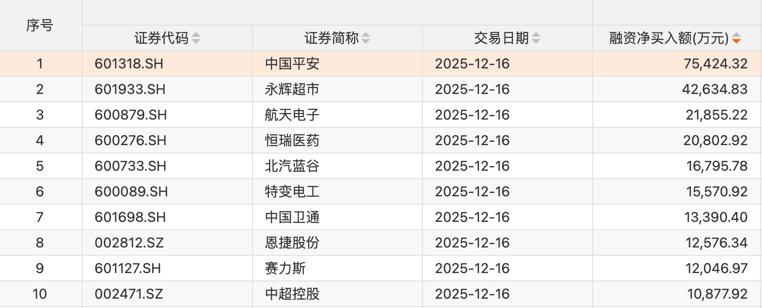 10只个股获融资净买入额超1亿元。中国平安获融资净买入额居首,净买入7.54亿元;融资净买入金额居前的还有永辉超市、航天电子、恒瑞医药、北汽蓝谷、特变电工、中国卫通、恩捷股份、赛力斯、中超控股等。
