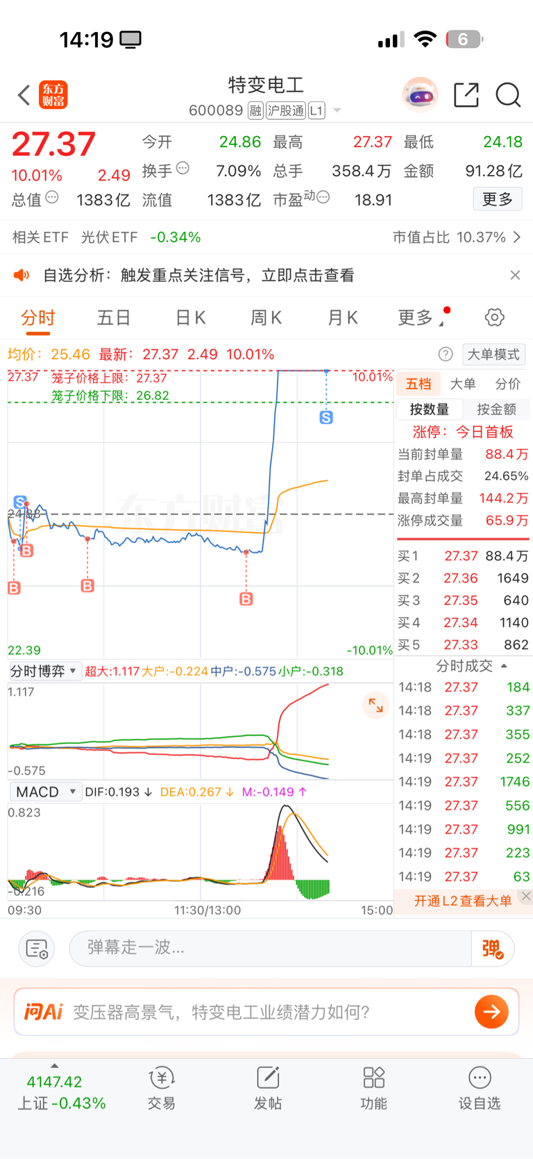 持股1600多天,早上眼花按错了按错一单,不影响。大盘今天的表显,经历过熔断的,