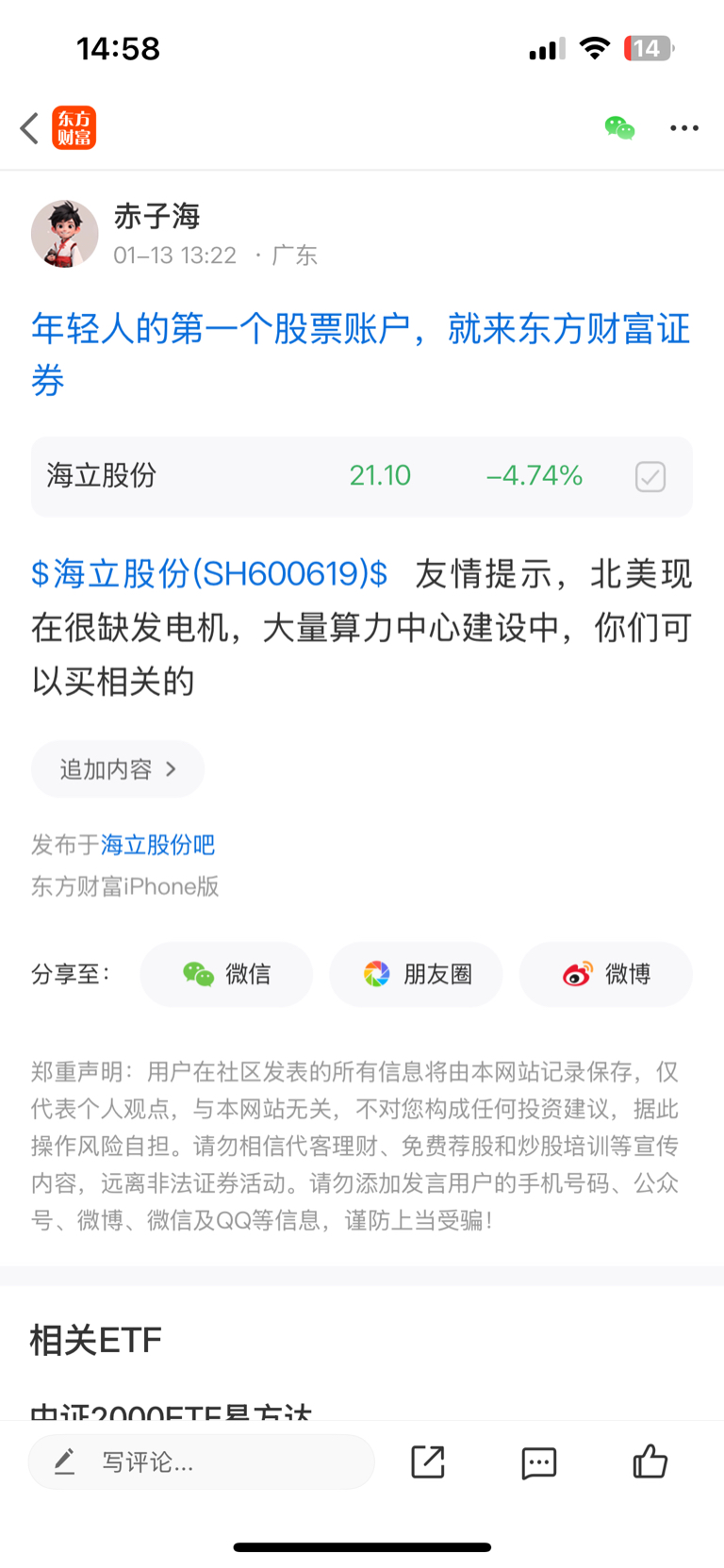 温馨提示: 1.根据《证券法》规定,禁止编造、传播虚假信息或者误导性信息,扰乱证券市场;2.用户在本社区发表的所有资料、言论等仅代表个人观点,与本网站立场无关,不对您构成任何投资建议。用户应基于自己的独立判断,自行决定证券投资并承担相应风险。《东方财富社区管理规定》