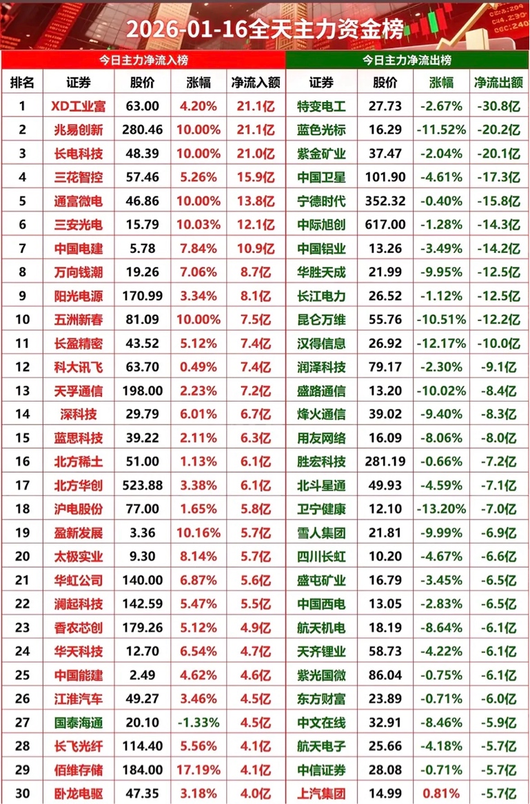 2026年1月16日主力资金榜,涨跌榜前30名一览!