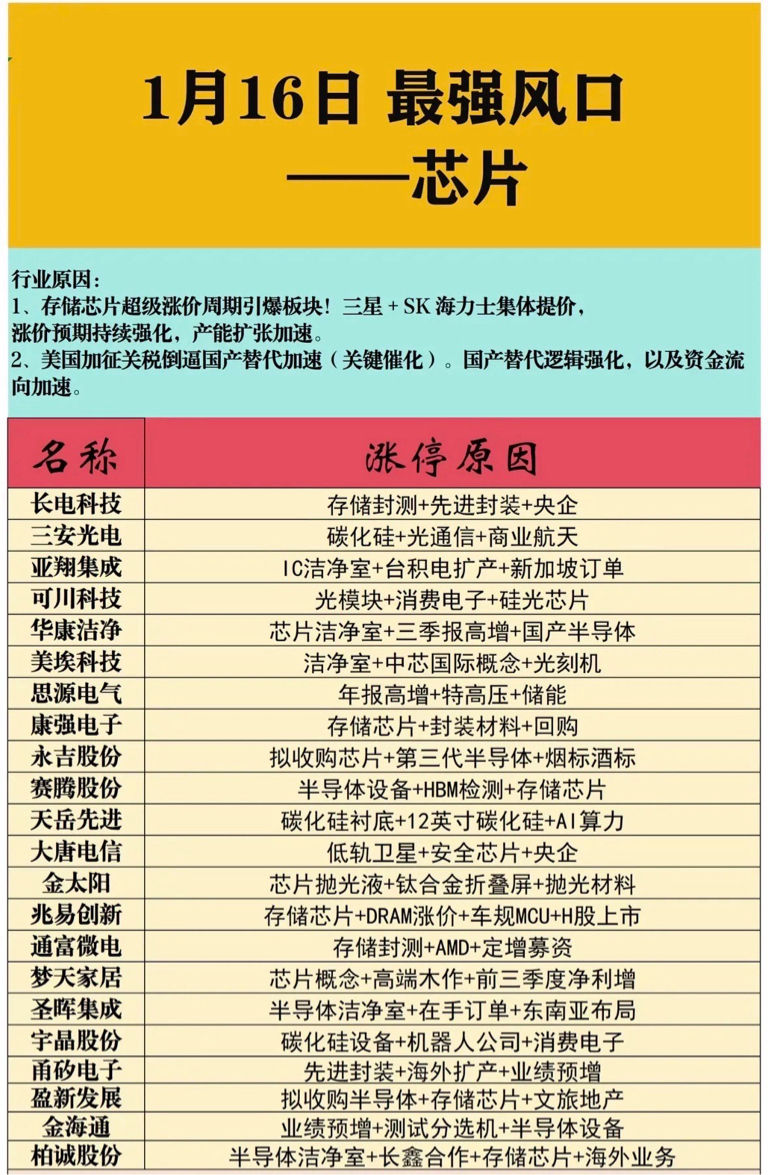 1月16日周五今日最强板块梳理芯片板块爆发!存储涨价+国产替代催化,长电、三安等