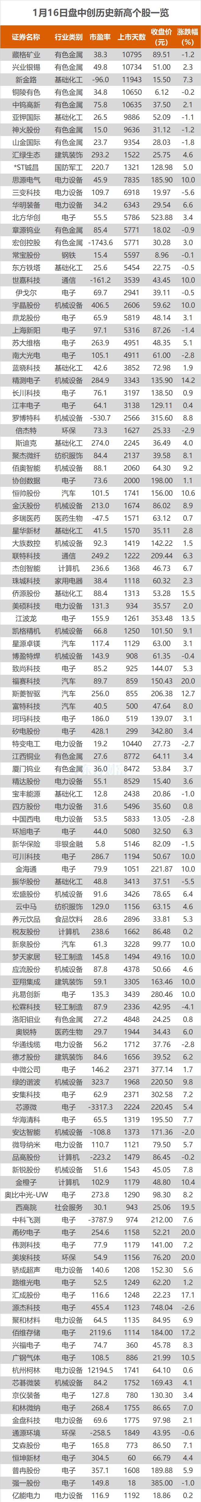 1月16日,A股三大指数今日集体小幅回调,沪指险守4100点关口。截止收盘,沪指跌0.26%,收报4101.91点;深证成指跌0.18%,收报14281.08点;创业板指跌0.20%,收报3361.02点。东方财富Choice数据显示,今日有116只个股盘中股价创历史新高,分别为特变电工、中国西电等。