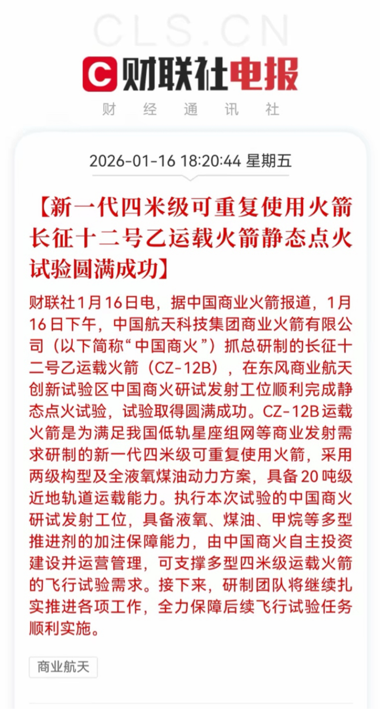 重磅利好!国产可复用的火箭长征十二号乙点火实验成功商业航天2026年最大看点就是
