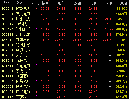 电气设备板块盘中全线爆发,截至收盘,亿能电力尾盘30%涨停,双杰电气20%涨停,灿能电力涨近18%,汉缆股份、森源电气、积成电子等连续两日涨停,思源电气、特变电工尾盘均涨停,另还有十余股涨停。
