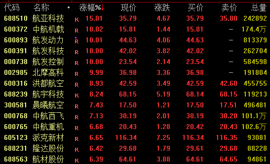 军工板块发力走高,航空股表现亮眼。截至收盘,航亚科技涨超15%,中航机载、航发动力、航发科技、航发控制等均涨停。