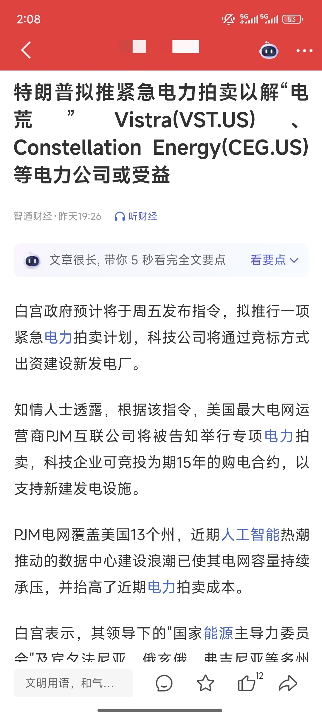 3、1月12日特朗普在其自营的社交平台Truthsocial上发文称:我绝不希望美国民众因为数据中心而支付更高的电费,科技公司必须为数据中心电费买单。并在1月16日特朗普推动紧急电力拍卖以解“电荒”。