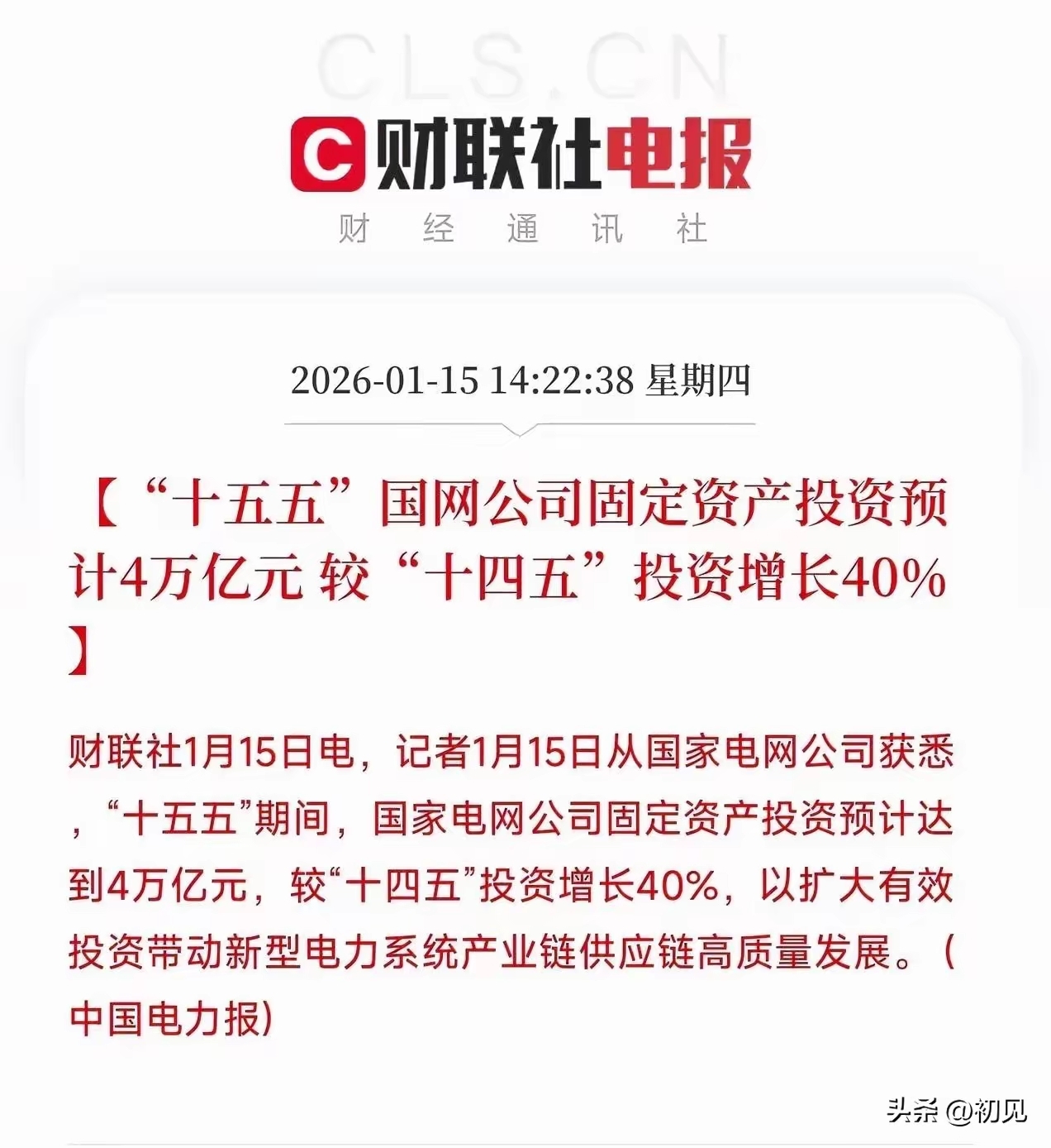 1、近期国家也在大力发展电力事业,“十五五”期间,国家电网公司固定资产投资预计达到4万亿元。