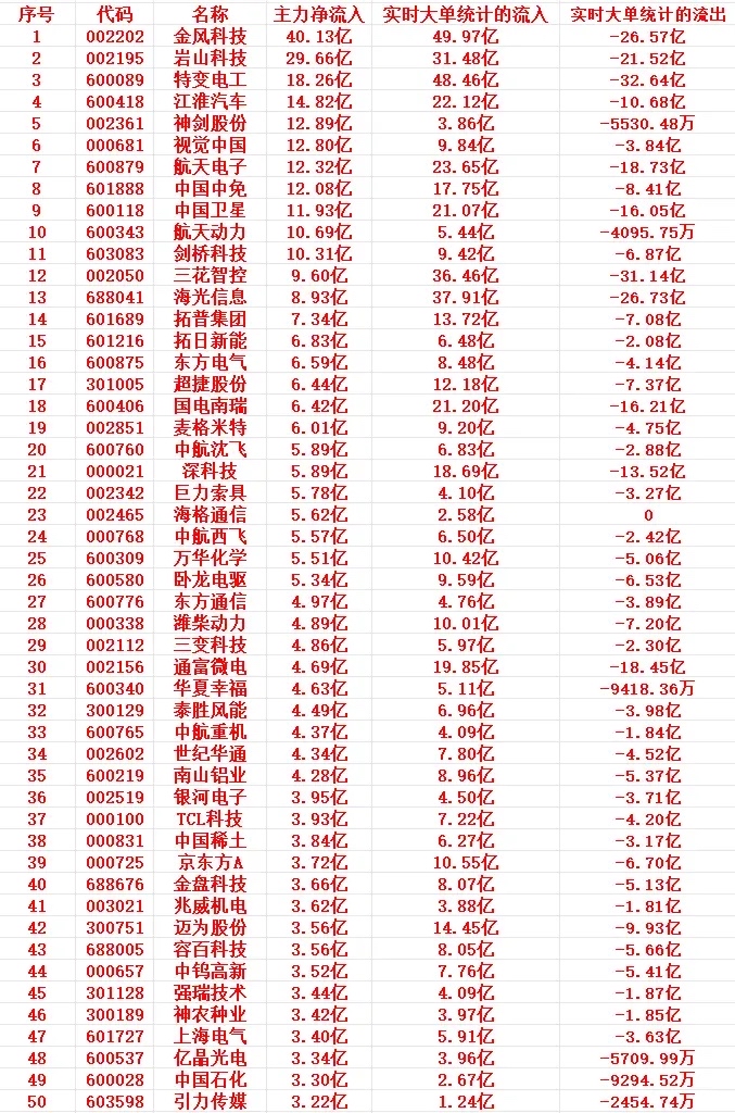 前 10 只个股主力净流入均超过 10 亿元,其中金风科技(002202) 以 40.13 亿的净流入遥遥领先,是第二名岩山科技(29.66 亿)的 1.35 倍,前两名的净流入规模远超其他个股,说明短期资金正强力抱团少数核心标的,市场资金的 “马太效应” 突出。