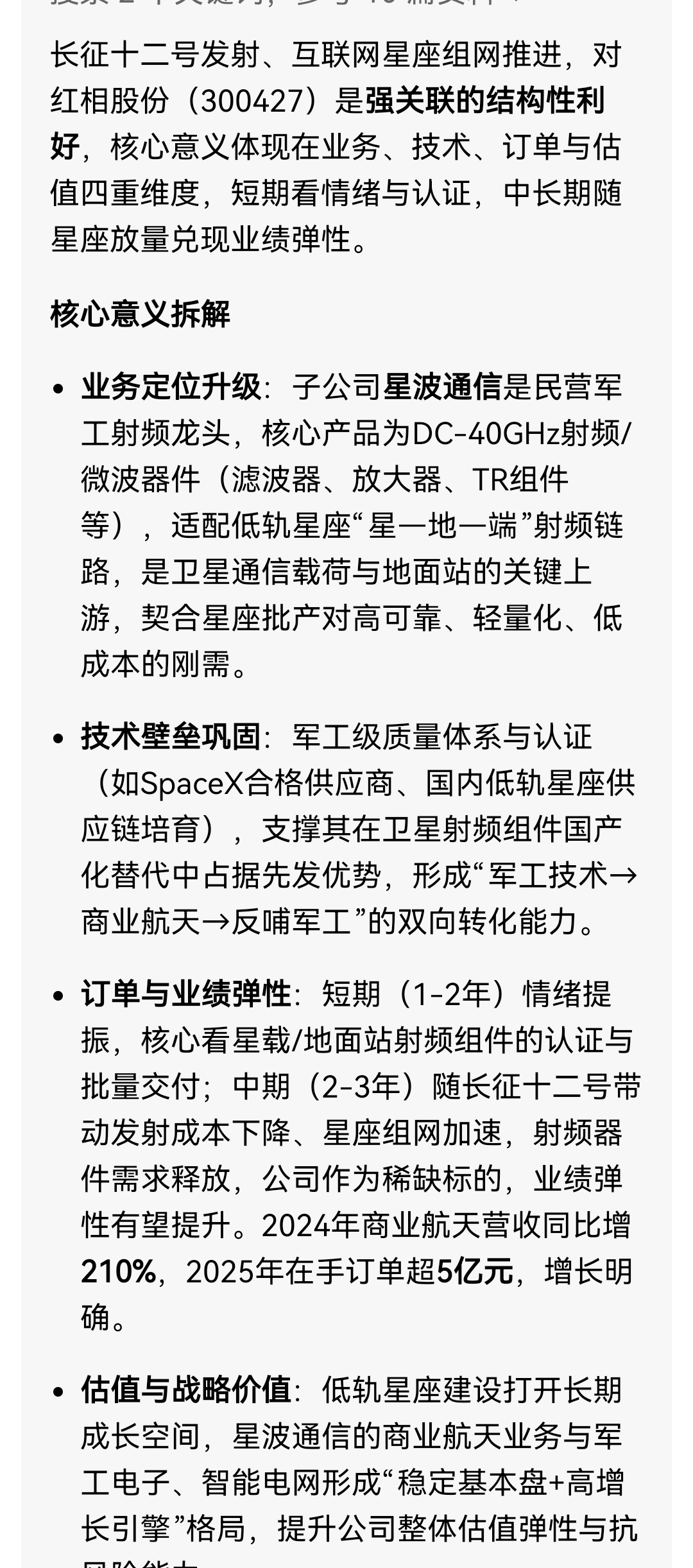 今天长征12号火箭发射成功,19颗低轨卫星互联网组网,对红相股份属实质利好,明天
