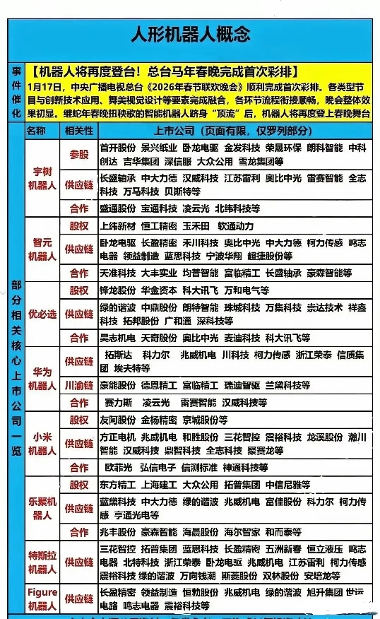 2026马年春晚的机器人表演,你们觉得会是谁上阵呢?个人认为大概率是多家厂商组团登场,并非单一公司上阵。简单来说,这次春晚机器人表演是一场“天团秀”,宇树、优必选、智元、科大讯飞等多家企业的机器人会在主会场和分会场各自亮相,共同呈现科技感十足的舞台效果。你们觉得呢?