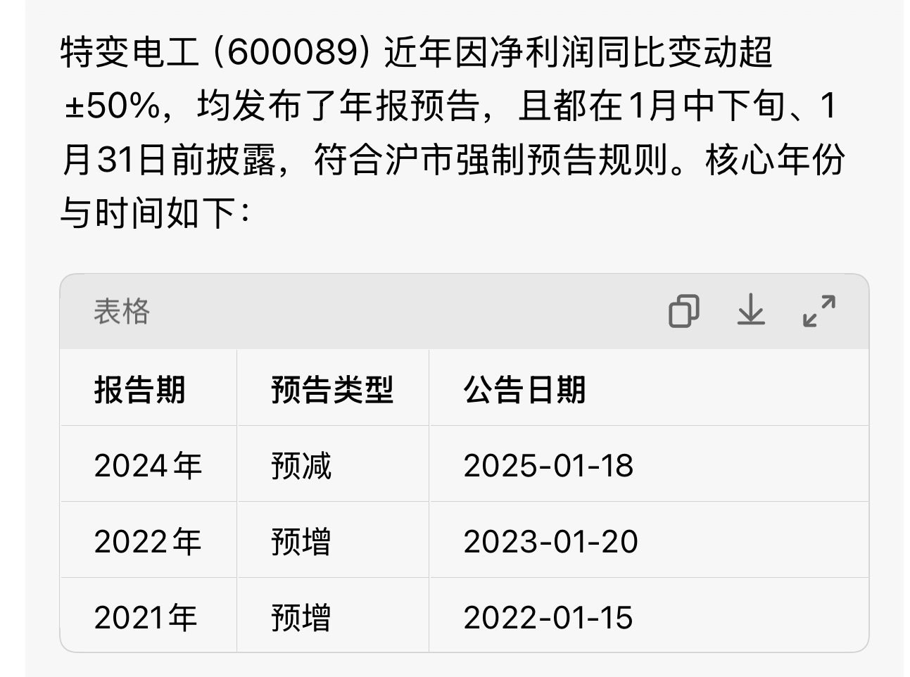 $特变电工(SH600089)$ 特变电工年报预报发布时间最迟明天! 特变24年净利润41亿,25年前三季度净利润53亿,也就是说第四季度只要净利润超过9亿就得发预报。近几年情况发布情况如下: