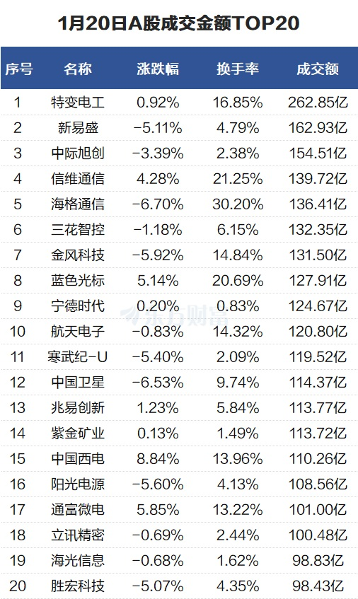 1月20日,上证指数跌0.01%,收报4113.65点;深证成指跌0.97%,收报14155.63点;创业板指跌1.79%,收报3277.98点。