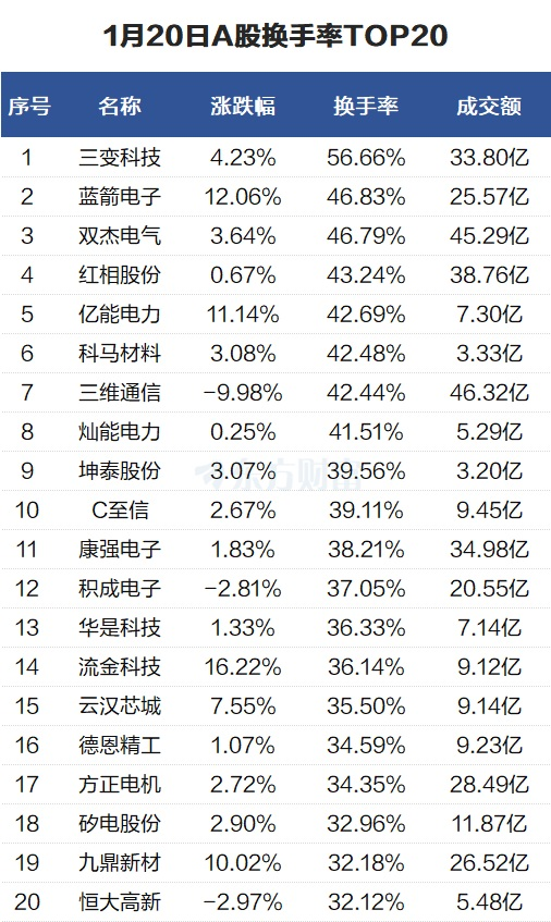 当天换手率最高的个股为三变科技,全天换手率56.66%。蓝箭电子紧随其后,全天换手率46.83%。