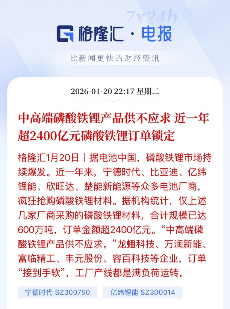 中高端磷酸铁锂持续紧缺,近一年相关订单金额已超2400亿元。电池中国消息显示,磷酸铁锂需求爆发,宁德时代、比亚迪、亿纬锂能、欣旺达、楚能新能源等头部电池厂大规模采购,合计锁定约600万吨材料。龙蟠科技、万润新能、富临精工、丰元股份、容百科技等材料企业订单爆满,产线满负荷生产。$特变电工(SH600089)$ $中国西电(SH601179)$ $湖南白银(SZ002716)$