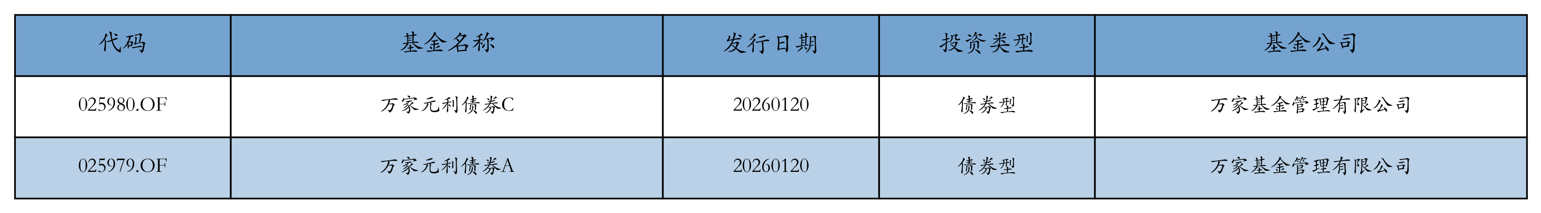 昨日有2只新基金发行,分别为:万家元利债券C、万家元利债券A,详情见下表: