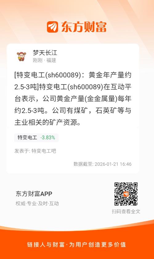 [特变电工(sh600089):黄金年产量约2.5-3吨]特变电工(sh600089)在互动平台表示,公司黄金产量(金金属量)每年约2.5-3吨。公司有煤矿,石英矿等与主业相关的矿产资源。