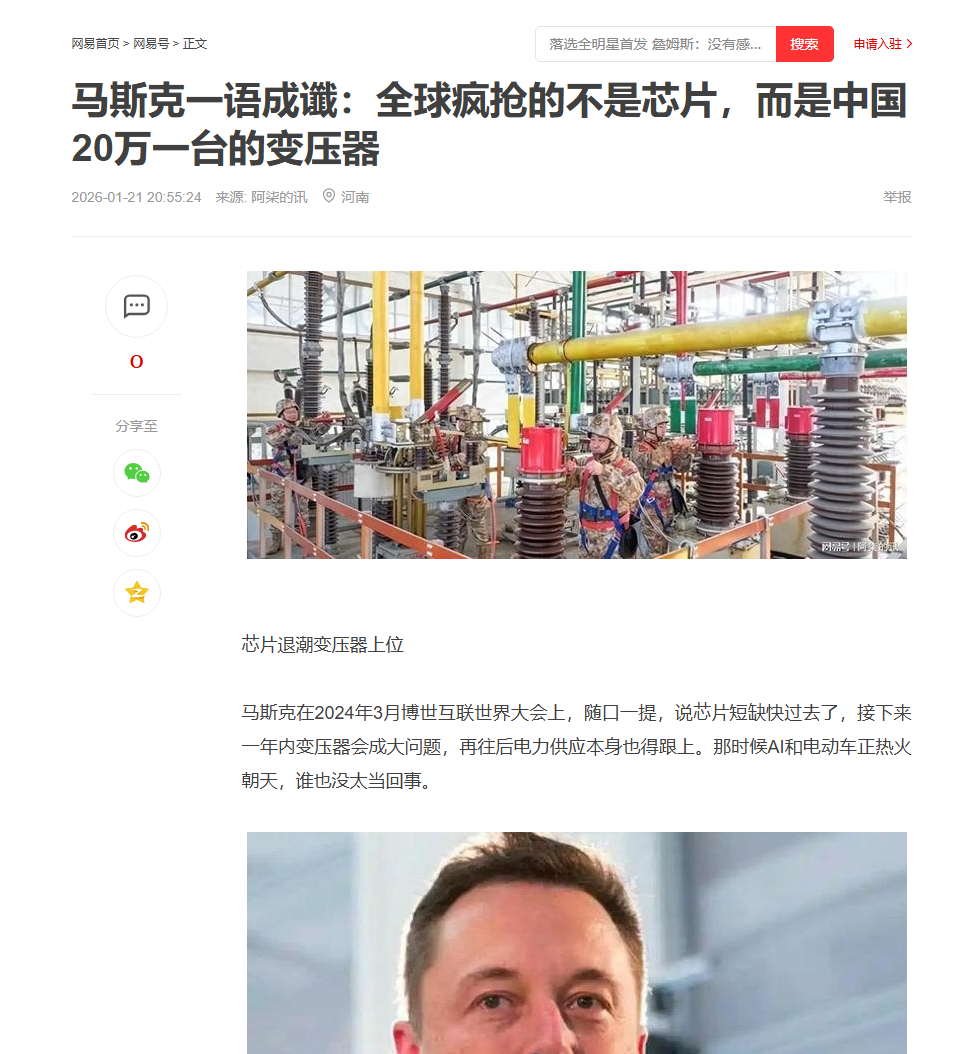 马斯克一语成谶:全球疯抢的不是芯片,而是中国20万一台的变压器
