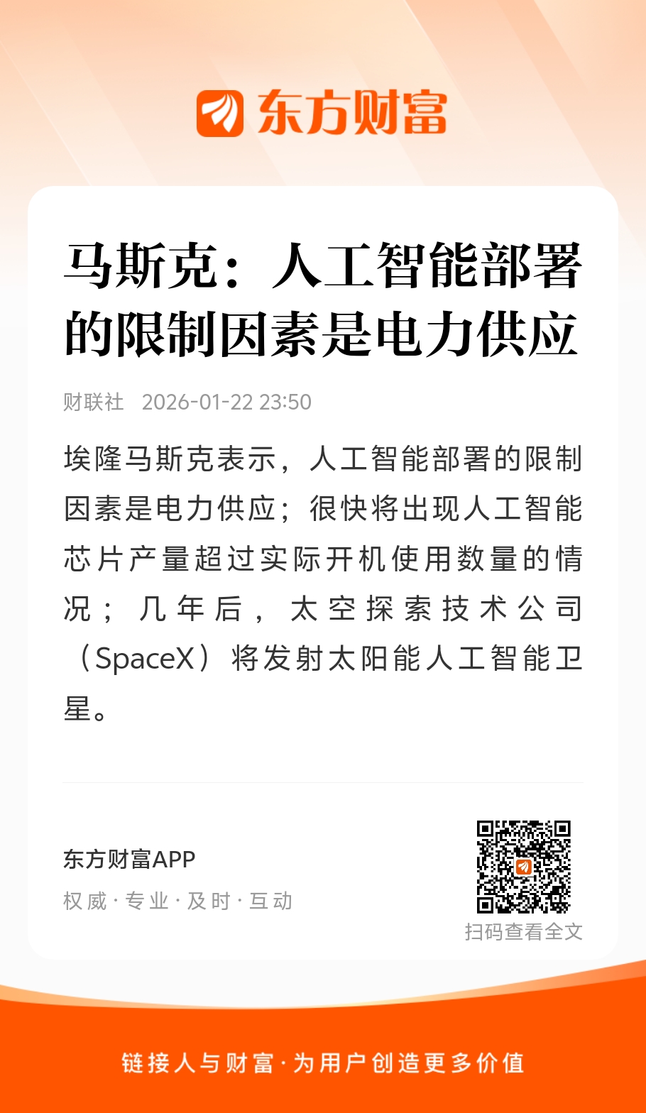 埃隆马斯克表示,人工智能部署的限制因素是电力供应;很快将出现人工智能芯片产量超过实际开机使用数量的情况;几年后,太空探索技术公司(SpaceX)将发射太阳能人工智能卫星。