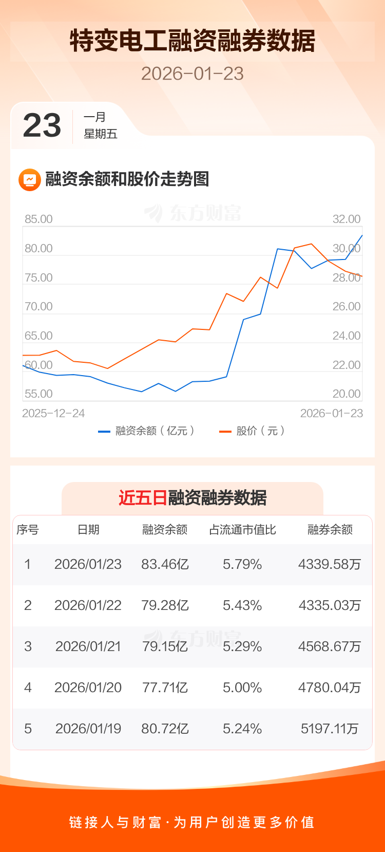 交易所最新数据显示,特变电工于2026年1月23日获融资买入19.13亿元,融资偿还14.96亿元,当日融资净买入4.18亿元。目前,该股融资余额83.46亿,占流通市值比例为5.79%。