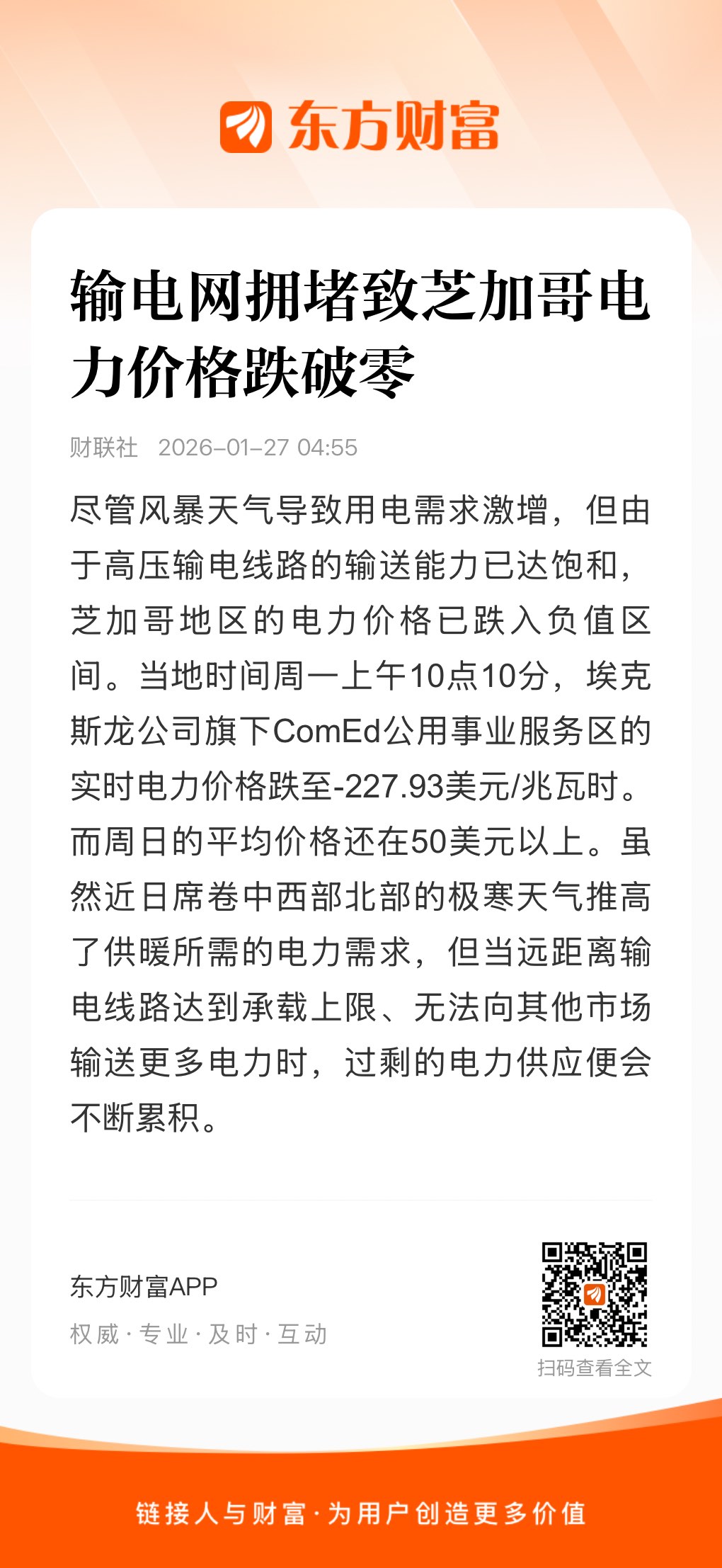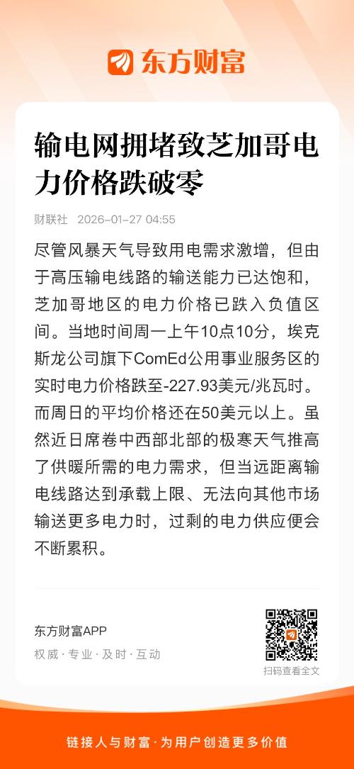尽管风暴天气导致用电需求激增,但由于高压输电线路的输送能力已达饱和,芝加哥地区的电力价格已跌入负值区间。当地时间周一上午10点10分,埃克斯龙公司旗下ComEd公用事业服务区的实时电力价格跌至-227.93美元/兆瓦时。而周日的平均价格还在50美元以上。虽然近日席卷中西部北部的极寒天气推高了供暖所需的电力需求,但当远距离输电线路达到承载上限、无法向其他市场输送更多电力时,过剩的电力供应便会不断累积。