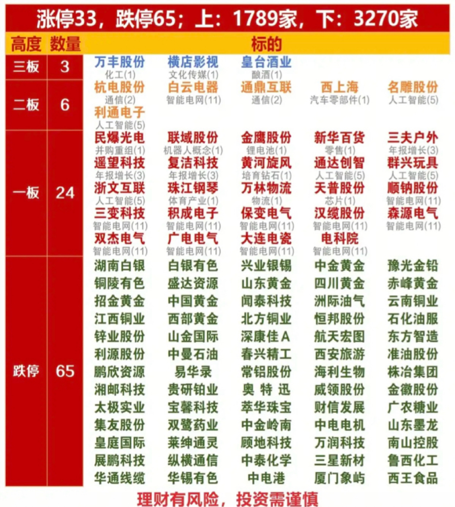 2.2周一涨停板股票:复盘统计!涨停板33家,跌停65家涨跌比1789:3270