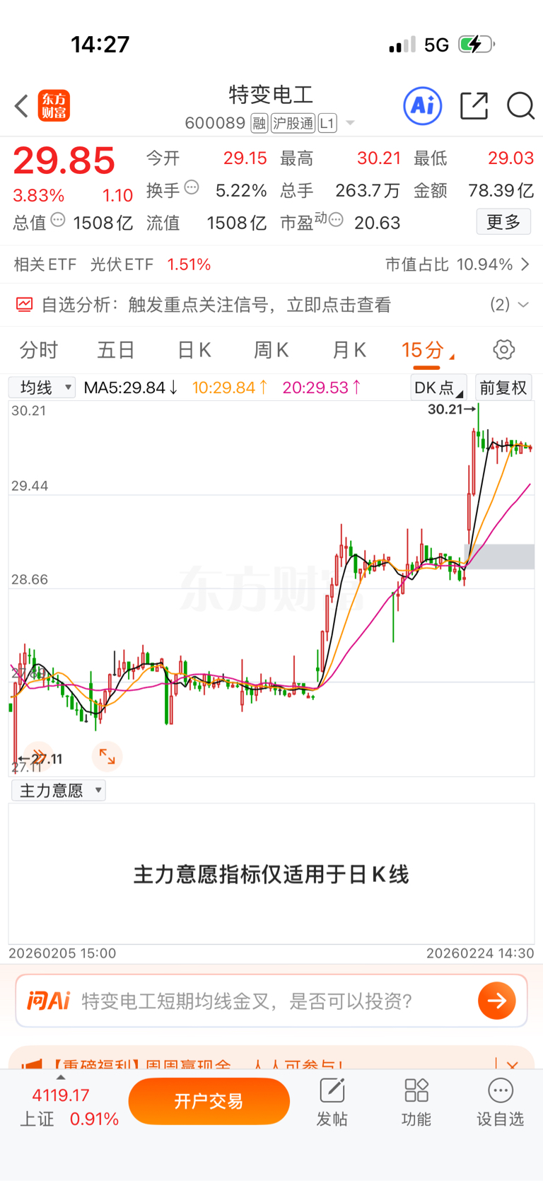 今天特变电工的五分钟线,十五分钟线,三十分钟线以及六十分钟都是同一势态。平稳丝滑。对比下来,五分钟线的走势比十五分钟线走得还要平滑,四个钟头的交易时段,既然横着走了三个钟头以上,最后五分钟向上窜高,股谚;横有多长竖就有多高。特变电工的股友们,春节前我们是福建名歌“爱拼才会赢”唱起来,节后让广东音乐步步高名曲响起来。恭喜特变电工股友收割那些各种各样的韭菜,发菜,发菜,发菜。