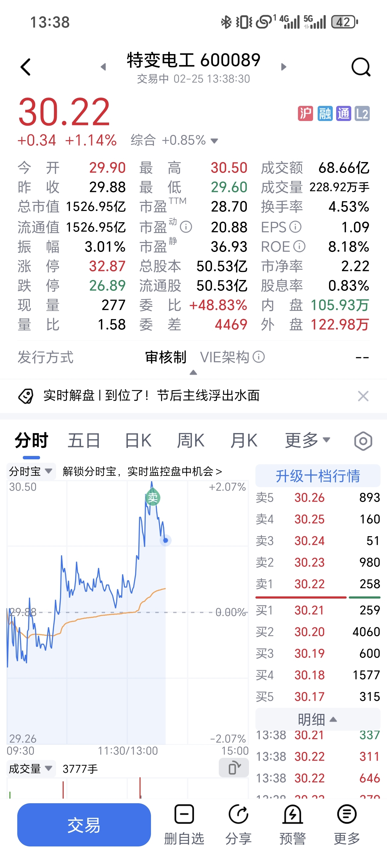 $特变电工(SH600089)$ 今天稍微减了点,提前委托30.5出了点,运气好卖在当日高点