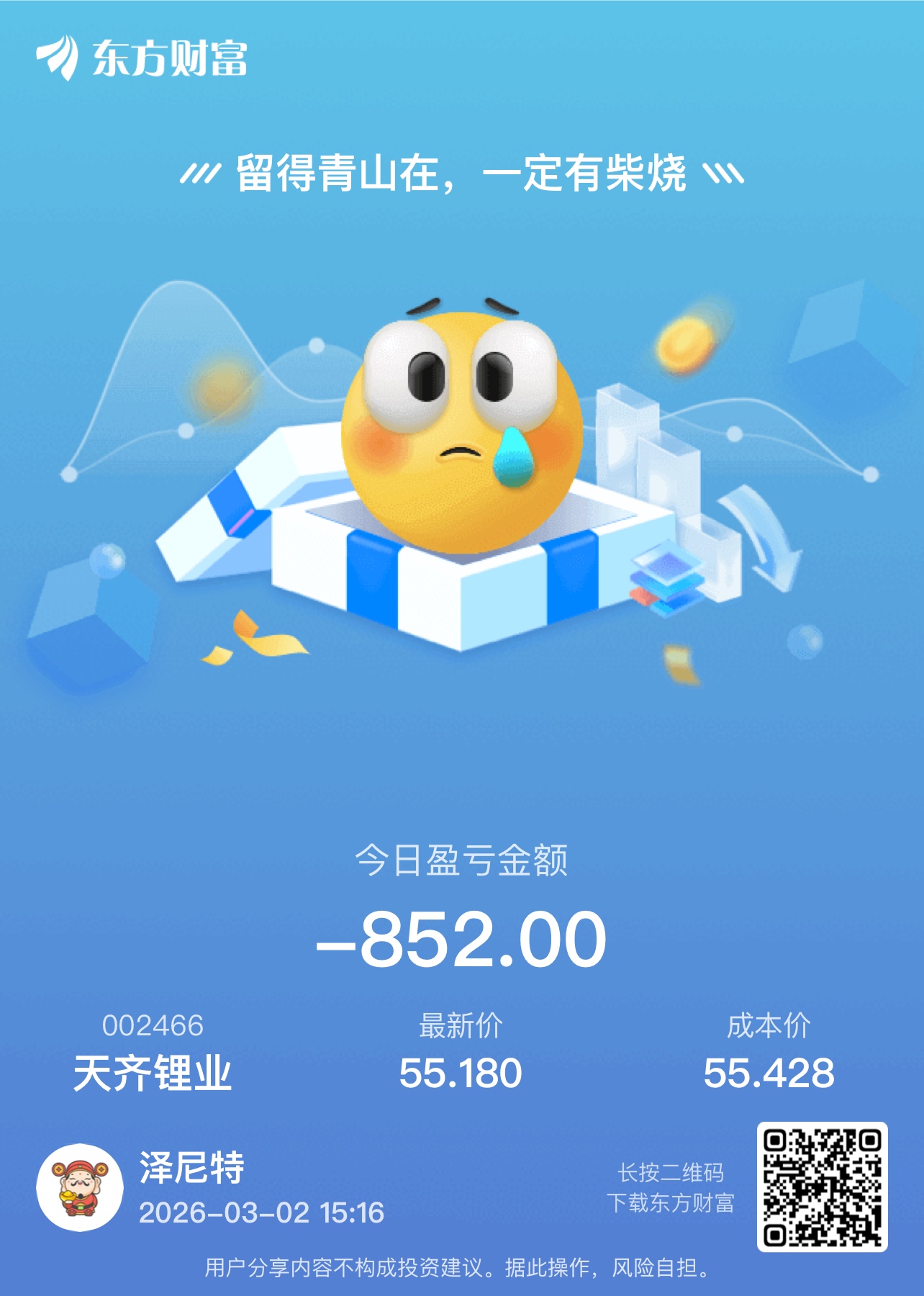 温馨提示: 1.根据《证券法》规定,禁止编造、传播虚假信息或者误导性信息,扰乱证券市场;2.用户在本社区发表的所有资料、言论等仅代表个人观点,与本网站立场无关,不对您构成任何投资建议。用户应基于自己的独立判断,自行决定证券投资并承担相应风险。《东方财富社区管理规定》