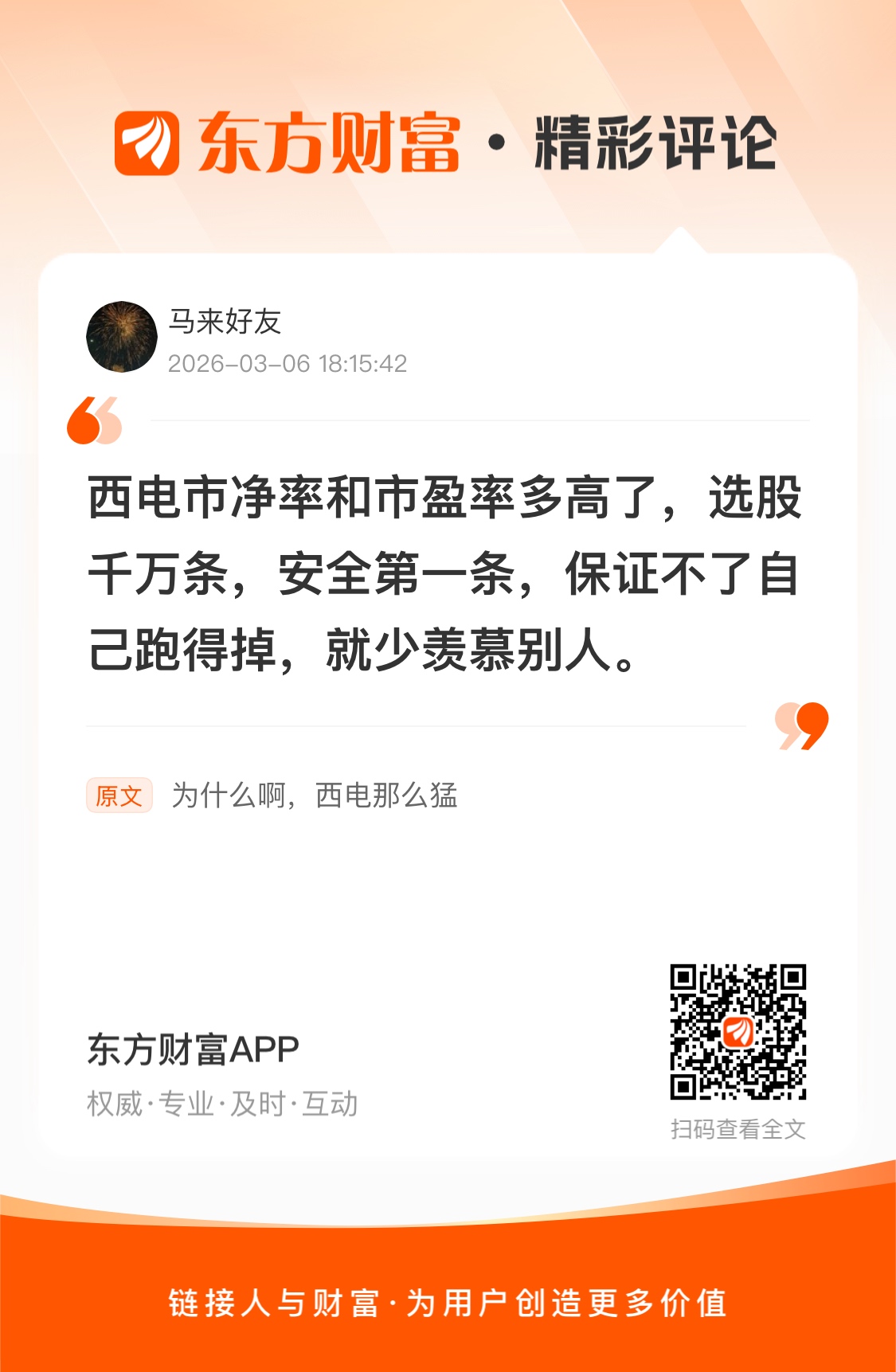 //@马来好友 : 西电市净率和市盈率多高了,选股千万条,安全第一条,保证不了自己跑得掉,就少羡慕别人。