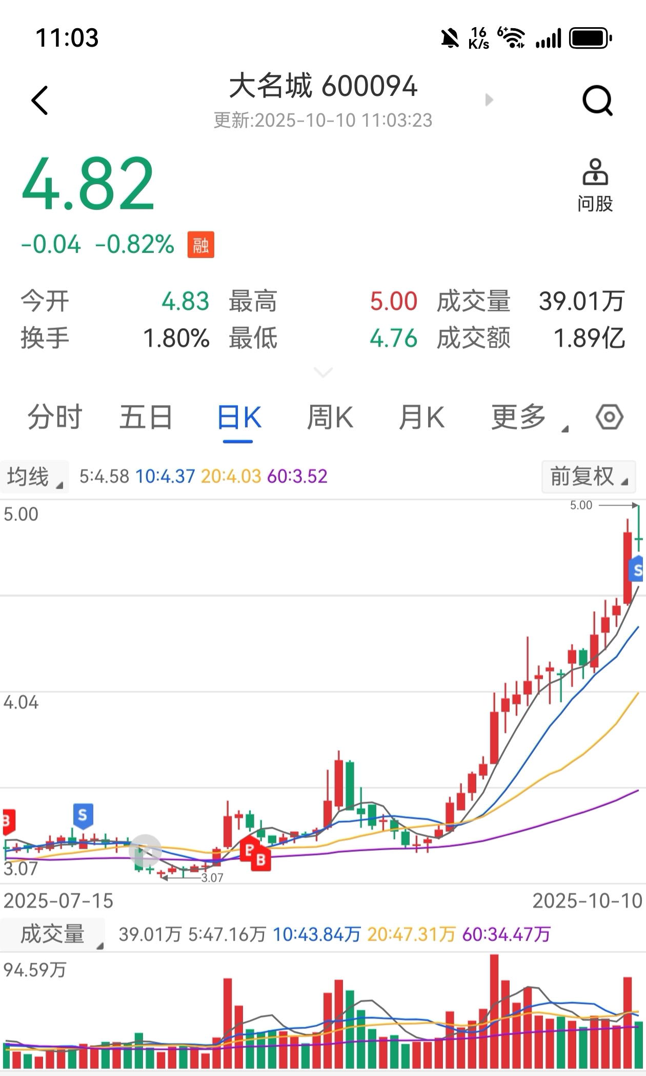 $大名城(SH600094)$ 我先走一步了,赚认知以内,可能还会继续涨,高度应该还是有的,我不走有些人也不敢猛拉。