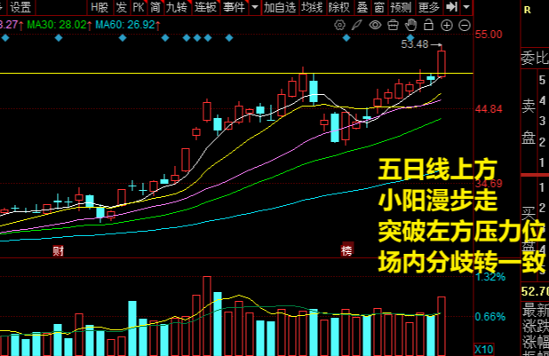 三花智控:人形机器人和汽车热管理。三花作为机器人的龙头近期一直受到市场青睐,前期价格小阳漫步走,沿着五日线向上,走的非常稳,住力控盘力度很强,今天下午在盯盘的过程中,看到大量的异动买入量,谷价突破前期左方高点压力位的时候,谷价在加速上涨,果断出手追了,今天收了一根放量大阳线,形成标准的N字攻击结构,短期大概率还有向上加速的行情。